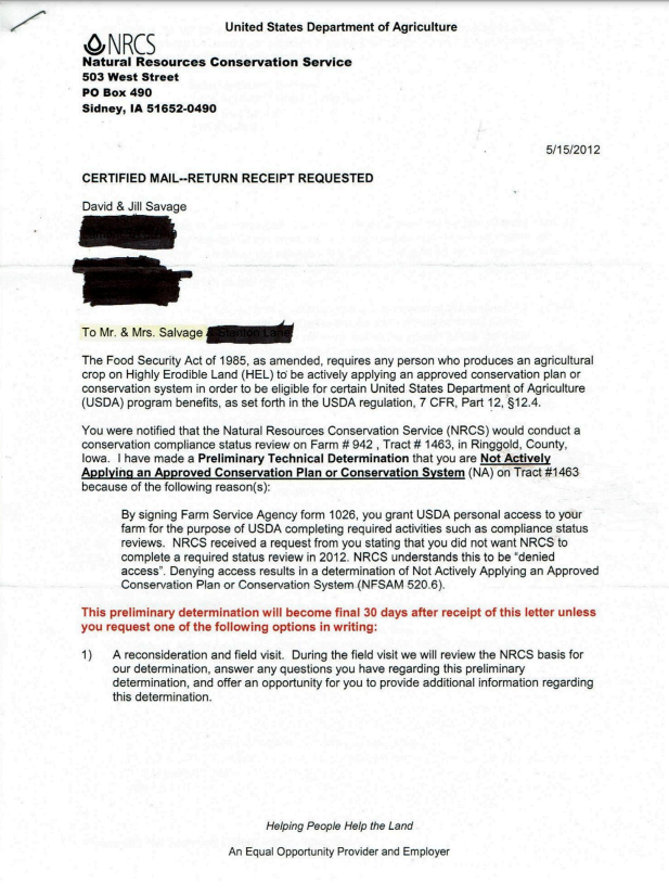 You were notified that the Natural Resource Conservation Service (NRCS) would conduct a conservation compliance status review on Farm #942, Tract #1463, in Ringgold County, Iowa. I have made a Preliminary Technical Determination that you are Not Actively Applying an Approved Conservation Plan or Conservation System (NA) on Tract #1463 because of the following reason(s): By signing Farm Service Agency form 1026, you grant USDA personal access to your farm for the purpose of USDA completing required activities such as compliance status reviews. NRCS received a request from you stating that you did not want NRCS to complete a required status review in 2012. NRCS understands this to be “denied access”. Denying access results in a determination of Not Actively Applying an Approved Conservation Plan or Conservation System (NFSAM 520.6).